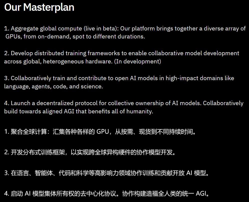 在此之前,Prime Intellect 已经在 1B 在参数规模上,实验了去中心化 AI 模型训练。这个团队说:「这样我们就可以到达我们 masterplan 步骤三:用于语言、智能和科学的开放式基础模型进行合作训练。」
