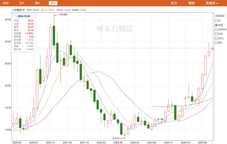 2018 年 7 月 9 日小米在香港上市,雷军表示,当天购买股票的人将获得双倍的利润。在这种情况下,小米在 2021 年做到过,1 月 4 那天,最高价格来了 35.9 港币。但是在接下来的一年里,其股价最低跌至发行价格的腰斩。