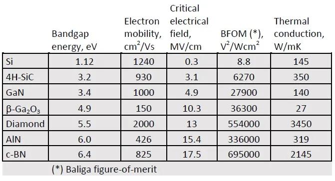 表 1:Si、WBG 和 UWBG 半导体的一些主要物理特性
