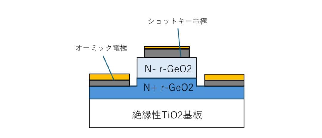 在实验中,Patentix公司首先将N沉积在绝缘TiO2基板上 型r-GeO2单晶膜,然后在上面沉积N-型r-GeO2单晶膜。NIMS随后通过干法蚀刻工艺清除N-层,显示N-层。 层,并在其上沉积和形成电极,从而构建了伪垂直结构的SBD(如图1所示)。最终,对其电流-电压特性(I-对V特征进行了评估。