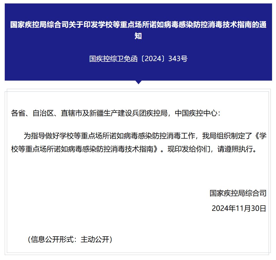11月30日,国家疾控局发布《诺如病毒感染防控消毒技术指南》,学校等重点场所。诺如病毒感染流行期间,学校、托幼机构、养老机构等重点场所应采取预防措施,定期使用适合消毒的液体进行预防性消毒。
