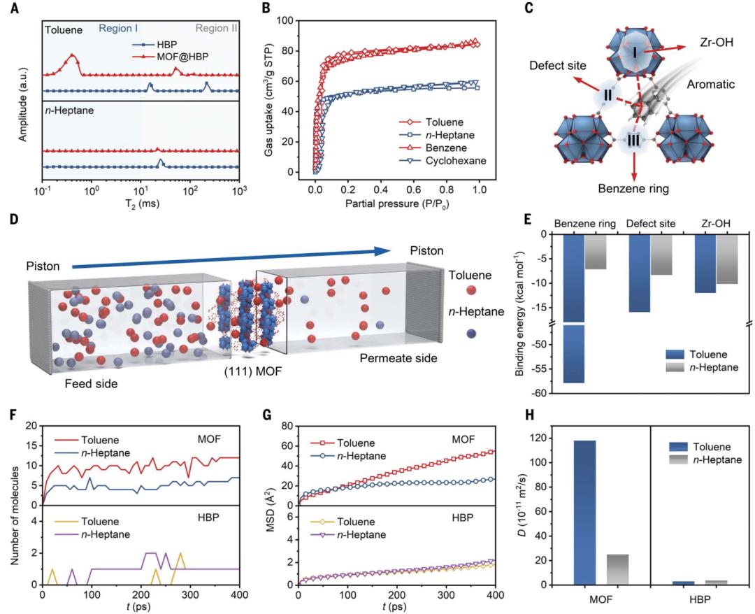 芳香族分子-脂肪族分子的分离性能通过相关表征和分子动力学模拟得到揭示。通过低场NMR表征研究孔中氢质子的放松时间(T2),可以获得孔的大小和溶剂分子的分布特征。