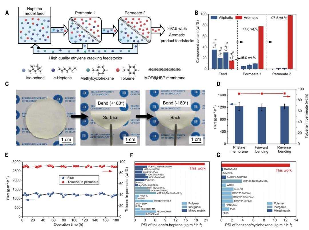 3. 提高MOF-高聚物膜的材料和结构,获得优异的芳烃-脂肪烃分离性能。
