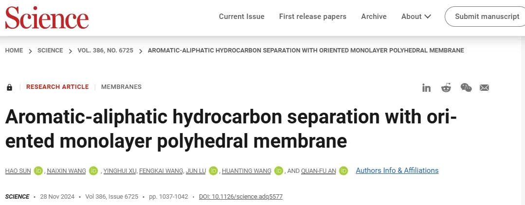 香族-脂肪族烃类化合物分离是一个具有挑战性的课题,同时香族-脂肪族分子分离也是一个非常重要的工业过程。进入挥发膜技术(Pervaporation membrane)具有处理这类问题的前景。正因为如此,北京工业大学王乃鑫教授、安全福教授等报道开发了一种单层多面膜OMP(oriented monolayer polyhedral),该OMP膜由单层有序多面体MOF颗粒组成,导向于枝状高聚物载体,OMP膜具有高密度的直径和选择性纳米通道,可选择性地传递芳香族有机分子,这项研究的结果是“Aromatic-aliphatic hydrocarbon separation with oriented monolayer polyhedral membrane"问题发表在Science上。