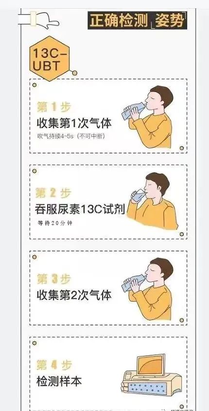 其检测原理:口服核素(13C或14C)标注的尿素后,如果胃中有幽门螺杆菌,可以将核素标注的尿素分解为核素标注的CO。CO2充血后,通过肺部呼出。通过收集被检测者呼出的气体,检查呼气中核素标注的CO2,可以判断是否有幽门螺杆菌感染。