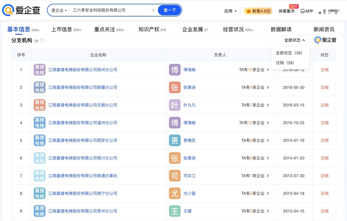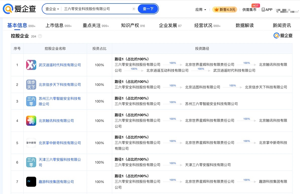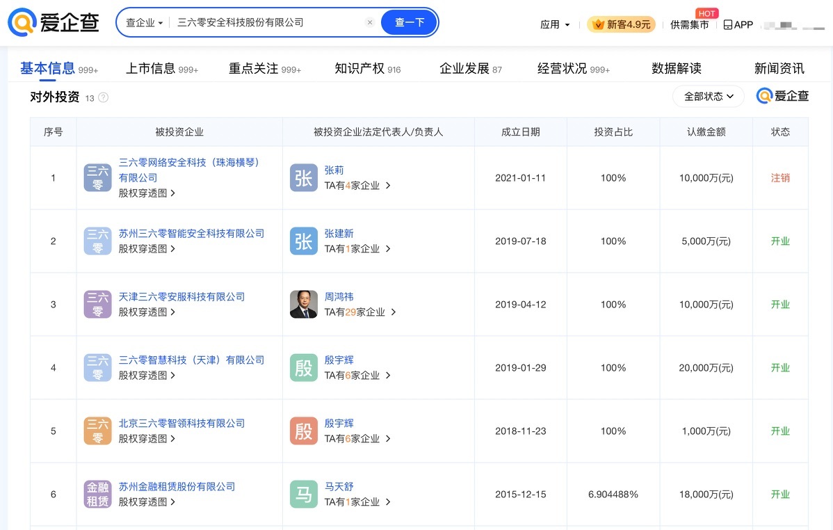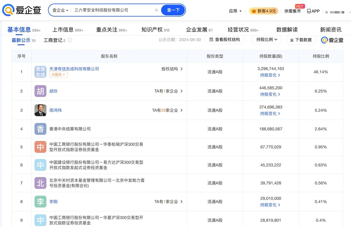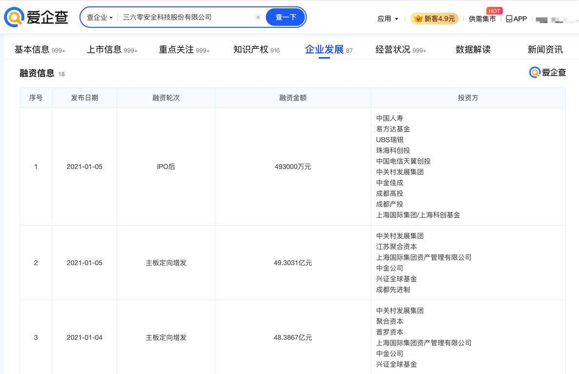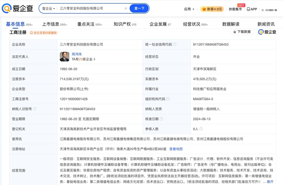 爱企查App显示,360安全科技有限公司成立于1992年6月,法定代表人为周鸿祎,注册资本约71.4亿元。经营范围包括网络安全服务、互联网设备销售、工业互联网数据服务、非居住地产租赁等。,由天津奇信志成科技有限公司、胡欢、周鸿祎共同持有。根据融资信息,2021年1月,该公司完成了一轮49.3亿元的融资,投资者包括中国人寿、E基金、UBS瑞银等。