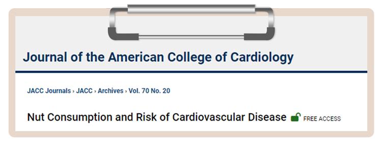 [1]Guasch-Ferré, M, Liu, X, Malik, V. et al. Nut Consumption and Risk of Cardiovascular Disease. JACC. 2017 Nov, 70 (20) 2519–2532.