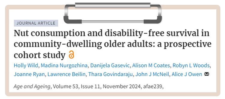[2]Holly Wild, Madina Nurgozhina, Danijela Gasevic, Alison M Coates, Robyn L Woods, Joanne Ryan, Lawrence Beilin, Thara Govindaraju, John J McNeil, Alice J Owen, Nut consumption and disability-free survival in community-dwelling older adults: a prospective cohort study, Age and Ageing, Volume 53, Issue 11, November 2024, afae239, https://doi.org/10.1093/ageing/afae239.