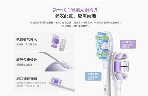 采用缓震无铜刷头,双旋刷柱设计,软胶包裹防打牙,绿刷褪色提示。
