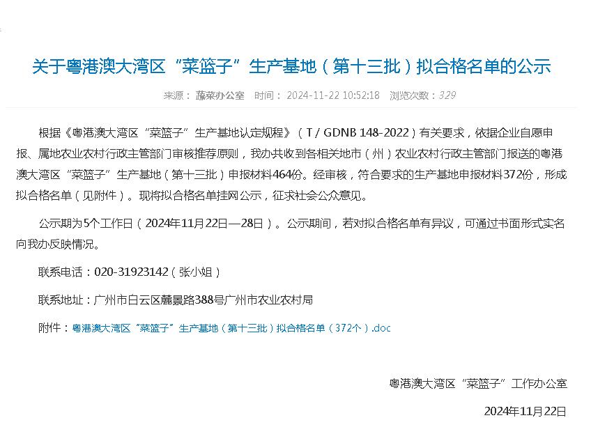 据了解,粤港澳大湾区的“菜篮子”生产基地位于粤港澳大湾区。经过特定的认定程序,被认定为符合一定标准和要求的农产品生产基地,旨在确保粤港澳大湾区的农产品供应,改善农产品供应。