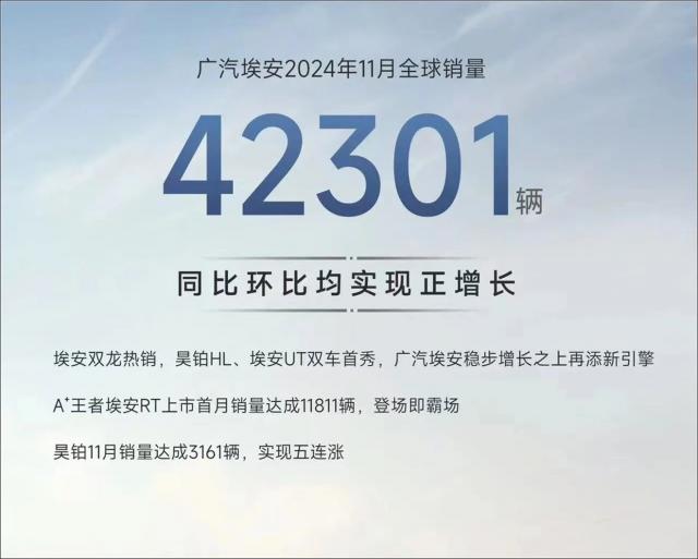 过去的 11 月份,根据埃安本人公布的销售数据,整个埃安的销售额又回来了。 4 万台 / 月度水平,达到 42301 车,其中,昊铂也售出了车辆。 3161 一辆新车。可以看出,在自我造血方面,广汽新能源业务仍然小有成就。