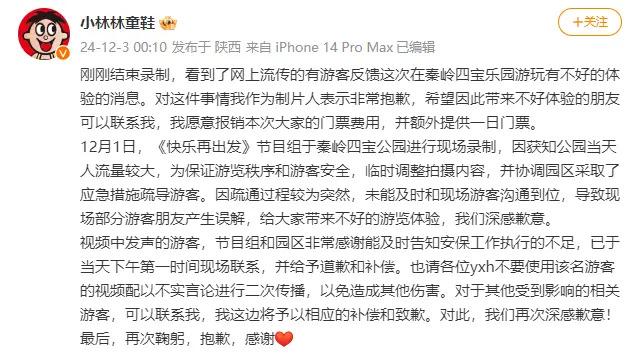 制片人说:“我在网上看到有游客反馈说这次在秦岭四宝乐园玩有不好的体验。对此我很抱歉。希望带来不好感情的朋友可以联系我。我愿意报销每个人的门票费用,并提供额外的一天门票。