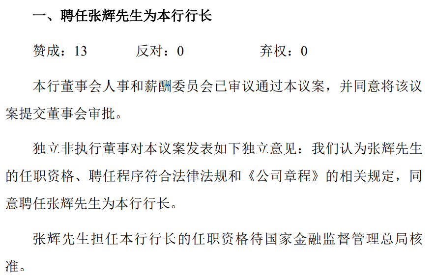 12月2日晚,中国银行发布公告称,该行董事会审议通过聘用张辉为行长的提案,其任职要求经国家金融监督管理局批准。