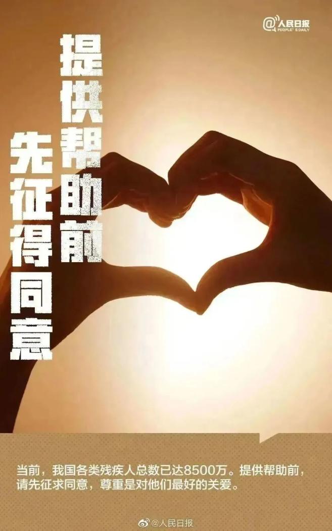 她们的世界要么黑暗,要么寂静,要么空间有限,要么异常孤独……你的接受、尊重和关心,对她们尤为重要。给予盲道让路,不要紧盯缺陷,不要占用残疾人专座等。同时,希望大家不要当面讨论自己的残疾情况和原因,微笑着面对他们,不要歧视或取笑他们。如有必要,他们会在获得他们的许可后给予礼貌的帮助...我们可以为这8600万人做些什么。