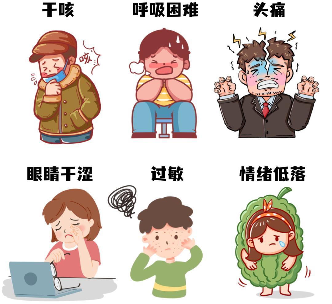 不良建筑综合征的症状因人而异,但常见的症状包括:呼吸道包括干咳、咽痛、呼吸不畅或鼻塞、头痛和疲劳、眼睛干涩、瘙痒或流泪、皮肤干燥或过敏、情绪和认知能力下降。