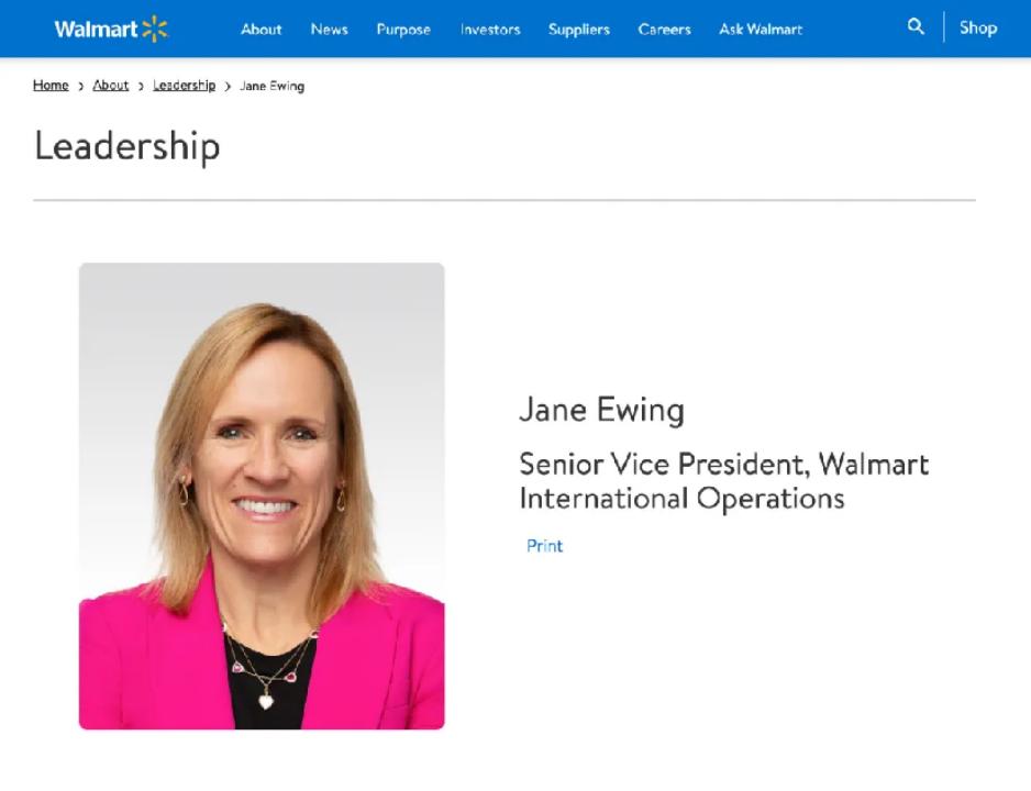 据援引沃尔玛的消息人士透露,Jane于2012年加入沃尔玛,翻看其简历,自2017年起,她担任沃尔玛国际部首席人力资源官,并于2020年调任沃尔玛全球可持续发展高级副总裁。2024年1月,Jane Ewing回到沃尔玛国际部担任运营高级副总裁,分管运营、供应链、房地产等部门。