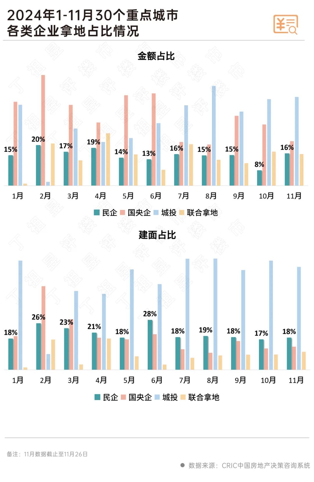 根据CRIC统计的30个城市含宅地块交易结果,民营企业的投资金额、建筑面积分别为15%和20%。