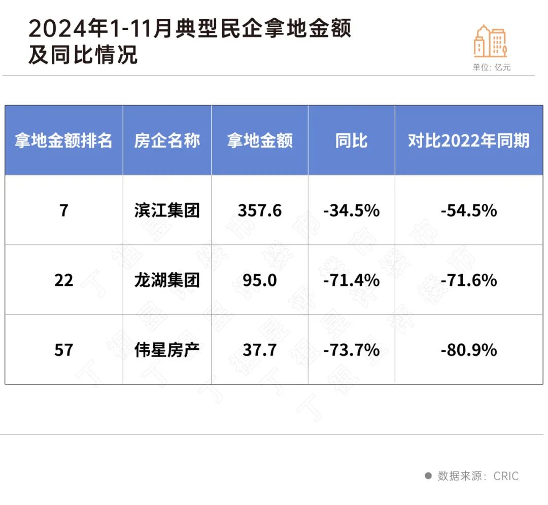 具体来说,滨江集团11月份的征地投资金额为357.6亿元,排名第七,但同比下降34.5%。11月份,龙湖和伟星没有土地入账,投资金额同比下降70%以上。