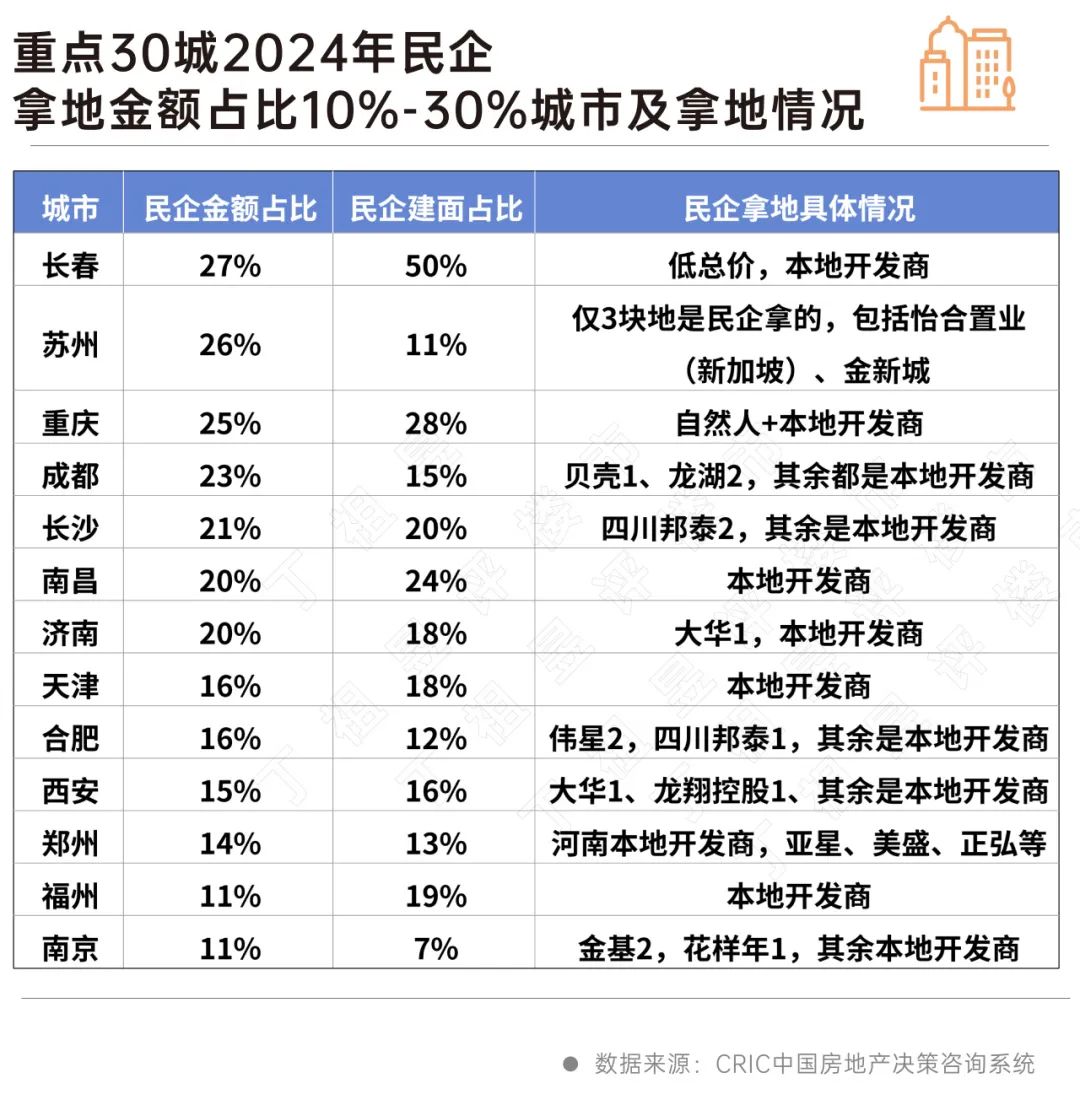 在长春、苏州、重庆等13个城市,今年民营企业征地比例占比。10%-30%之间。
