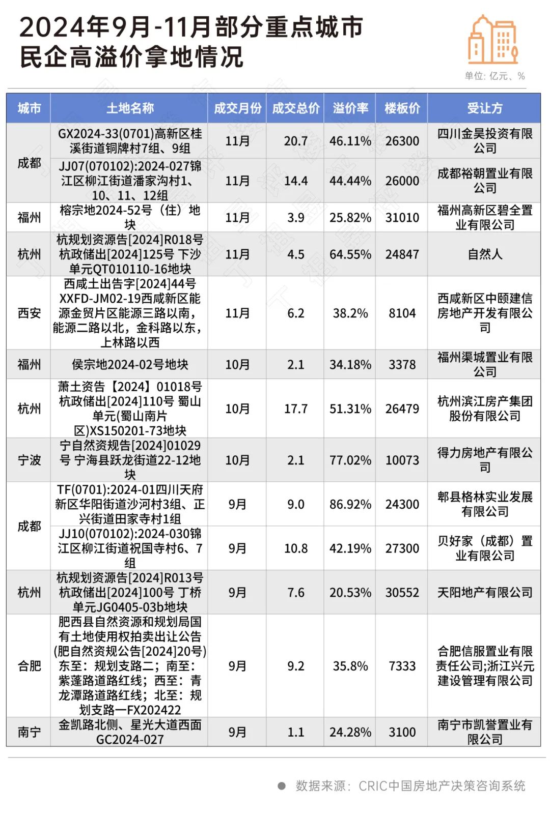 根据CRIC不完全统计,9月至11月,30个重点城市的土地交易,至少有12块地块被民营企业高溢价拍摄(溢价超过20%),这类高溢价地块主要分布在成都、杭州、西安、合肥等地,高溢价交易的土地多为低于10亿元的地块是主要的。