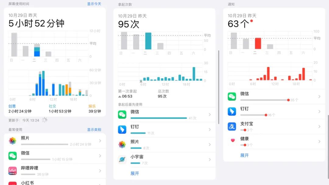 把我自己用的东西拿出来 iPhone 举例, 它自带就有「屏幕的使用时间」功能,你可以看到每天使用手机的时间,也可以看到不同类型软件的使用时间,单个软件。 app 使用时间,再往下也能看到每天拿起手机的次数,每天通知手机数量的数据。