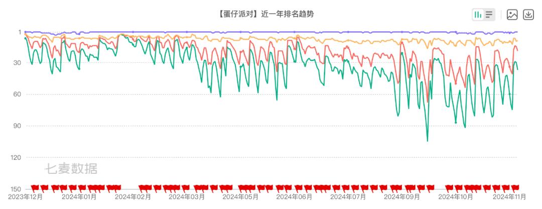 笔者猜测,这与蛋仔派对营收下滑有很大关系。从上图不难看出,去年12月蛋仔派对热销排名短暂下滑后迅速拉升,主要是因为春节期间客户回归。然而,从今年3月开始,蛋仔派对热销排队开始大幅波动。