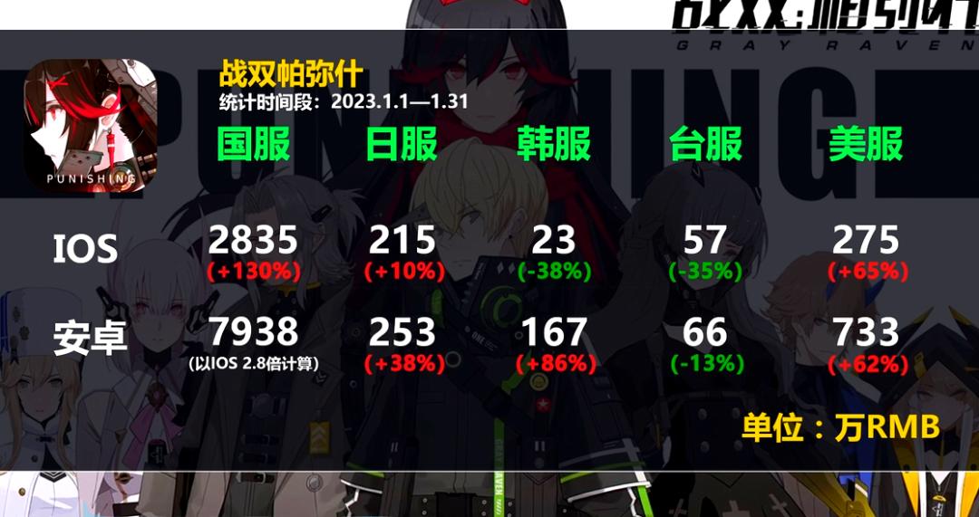 营收方面,库洛在《鸣潮》上市前,仅依靠《战双帕弥什》的产品支持。根据二哔哩哔哩UP主次元游戏的观察数据,在《战双帕弥什》22中、23年流水分别为57676万元,50663万元。