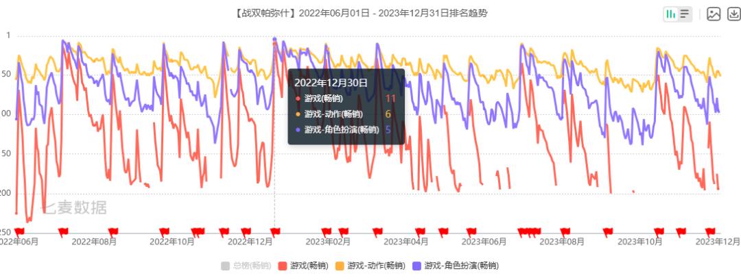 第二,《战双帕弥什》在内容形式上的探索取得了初步成效,从21年9月开始,「丽芙·极昼」二代人体的出现,在内容方式上,由以往的重操作动作玩法。 文字情节的方式,转变为重操作。 重新表演的方式,甚至在后续的游戏情节中,也逐渐尝试融入增加沉浸感的元素。在22年底的节点上,《战双帕弥什》能够实现增量,并在流水中创造历史新高,这也是关键原因。
