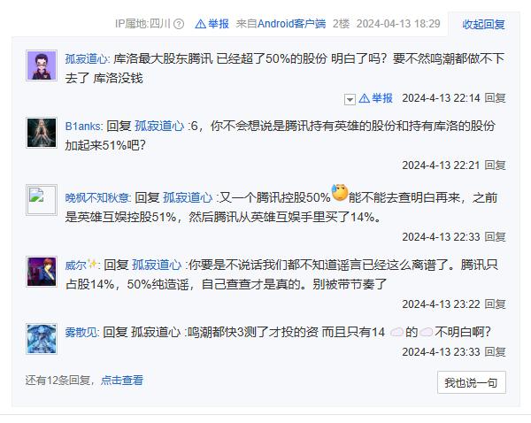 其实这个推断早就有了前兆。在今年4月大潮上线之前,有人在贴吧爆料腾讯拥有库洛股份已经超过50%,甚至说没有腾讯的加持,大潮可能做不到。