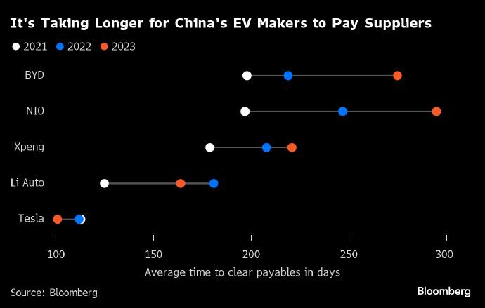 根据BloombergNEF的一份研究报告,2023年理想供应商的账期有所下降,在比亚迪、蔚来、小鹏这些家庭中有优势,其中只有特斯拉缩短了账期。
