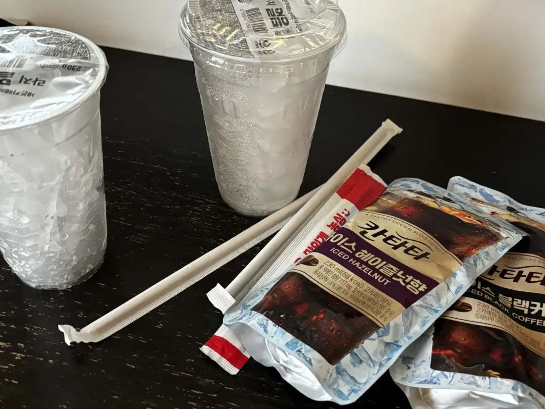 然而,单纯的咖啡液并不能满足韩国女性。在美国之前加一个“冰”是韩国女性喝咖啡的精髓。因此,卡塔塔的架子旁边总是有一个装满冰杯的冰柜。一杯预制咖啡液可以拆两个sku赚两笔钱。乐天赚很多钱是一回事,更重要的是韩国女性更满意。