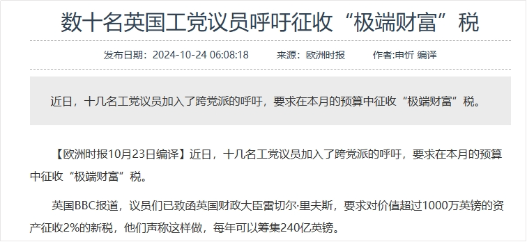 今年10月,英国进行了民意调查,63%的公众支持征收富人税。具体计划是对超过1000万英镑的富人资产征收2%的税。