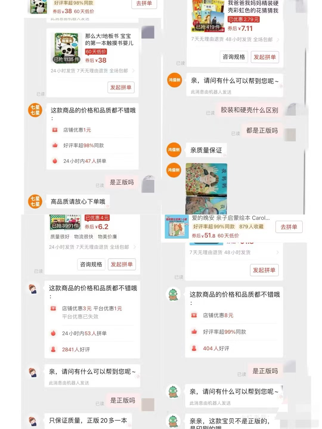 “如果你不问,你会震惊的。”洪晓(化名)最近正在为侄女选择生日礼物。为了选择合适的绘本,她在电商平台上问了很多商家:“是原版吗?”但是,我发现大多数商家给出的答案都是模糊的。“我不敢肯定答案是原版,要么质量有保证,要么质量高,原版不会是这个价位。有些商家甚至直言不是正版,而是印刷品。”