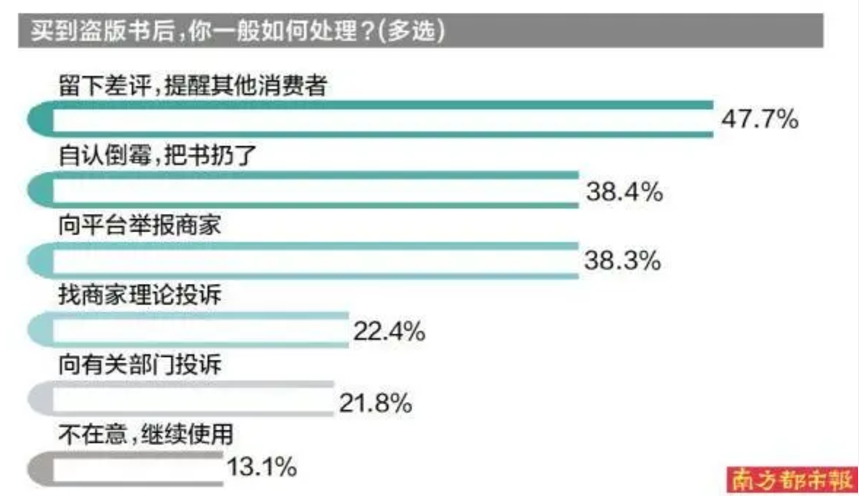 这个问题已经不是什么新鲜事了。南都大数据研究院曾发起网络问卷调查,数据显示,超过八成半的受访者曾在网络电商平台、短视频直播间购买过盗版书籍。