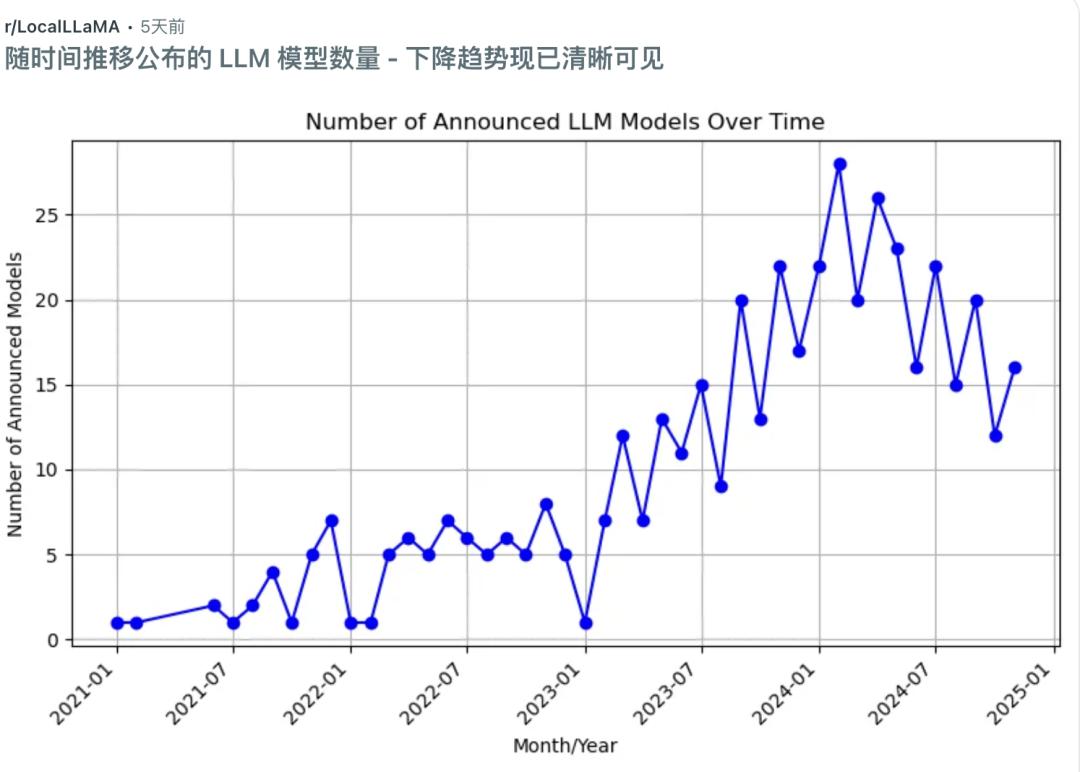 今年2月,全球发布了28个新模型,达到了历史最高点。随后,这一数字开始持续下降。10月份,全球只有12个新模型,回到了2023年上半年的水平。