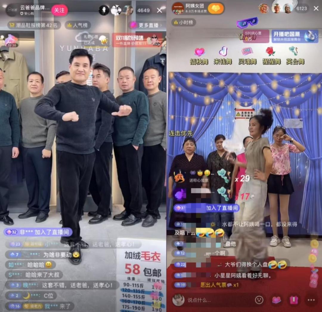 划到另一个直播间,一排叔叔整齐地站在“云父亲”里,穿着polo衫或立领保暖棉袄,有的僵硬地摇头晃脑,然后用幽默的表情掩盖自己的愚蠢。另一方面,在“阿姨女团”里,四五十岁的大妈们,虽然皮肤黝黑,眼睛皱巴巴的,但是跳插秧舞、抓钱舞、机车舞都不马虎,可以看到一些年轻时的风采。