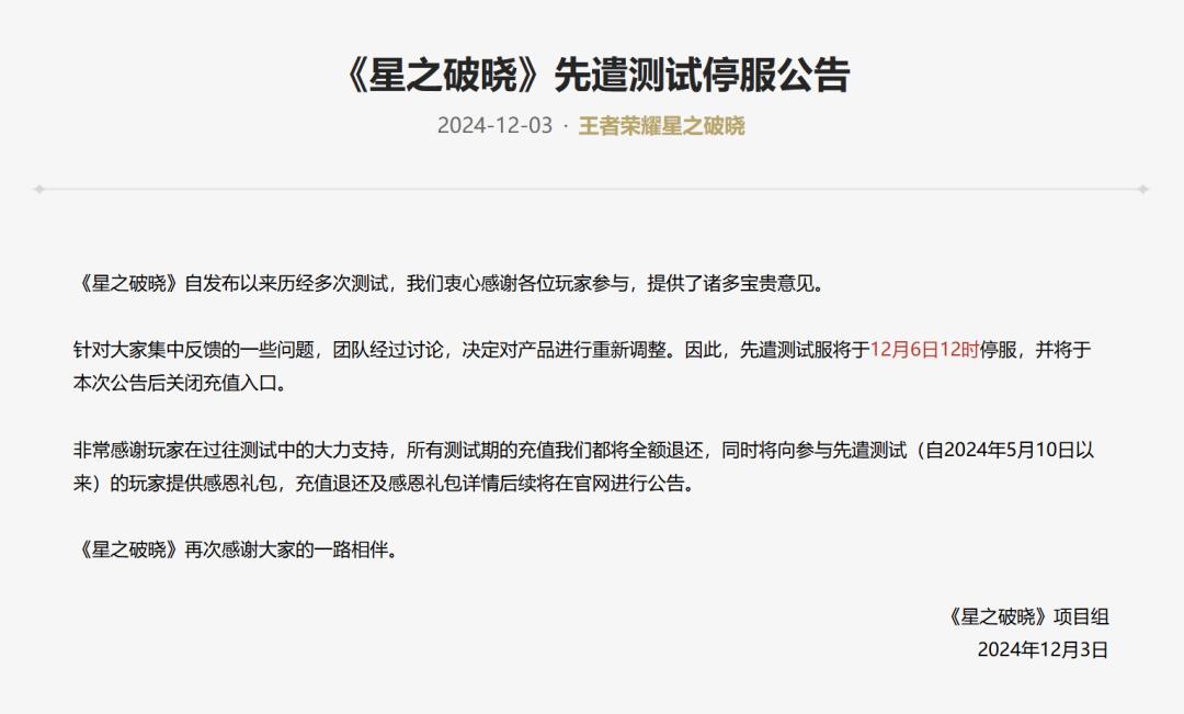 今天(12月3日)下午,腾讯动作格斗游戏《星之破晓》宣布,今年12月6日,5月10日上线的限号测试【格斗大师先遣服】将正式停止。该公告发布后,游戏将关闭充值入口,所有在测试过程中在游戏中充值的玩家将获得全额退款。《星之破晓》项目组在公告署名时,也对一直关注和支持游戏的玩家表示感谢。