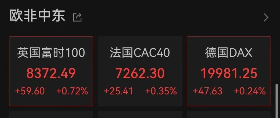 其它市场方面,欧洲大部分股市都在上涨,其中,英国富时100指数上涨0.66%以上,法国和德国的重要股指也在上涨。