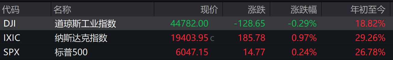 12月2日美东时间16月2日:00,道指44782点,跌幅为0.29%。;纳斯达克指数收涨0.97%,报19403.95点,创历史新高;标准普尔500指数收涨0.24%,报6047.15点,创历史新高。盘中,纳斯达克指数涨至19436.92点,标准普尔500指数涨至6053.58点,均创历史新高。