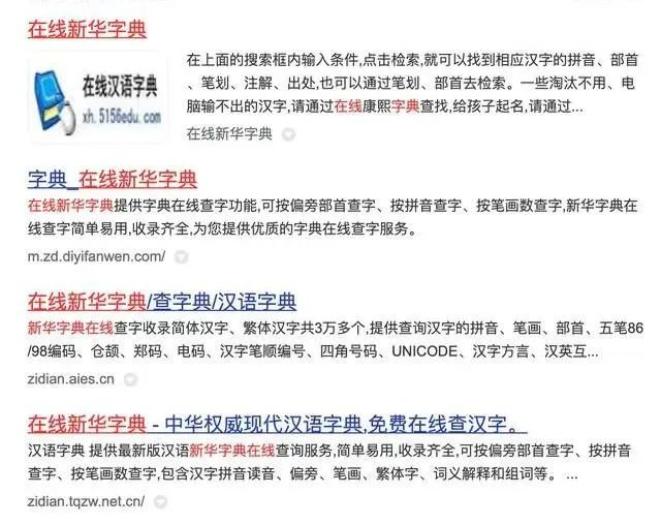作为第一本用白话解释的中文参考书,《新华字典》的民族性和权威性是显而易见的,大家都习惯了先查字典,读写不确定的单词。在网络上,顾客看到“新华”二字,很容易产生自然的信任。众所周知,目前网页上存在的“网上新华字典”、“网上现代汉语词典”等网站都没有获得授权,而且大部分都是以词典业务为引流方式,然后跳转到范文下载、命名测量等收费业务。字迹不明不说,还可能被诱导出钱,内外地也败坏了《新华字典》的权威形象。