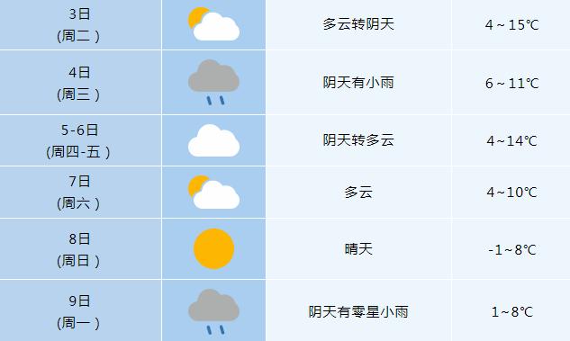3日(周二):江北多云转阴天,部分地区有小雨;江南阴天有时晴天。