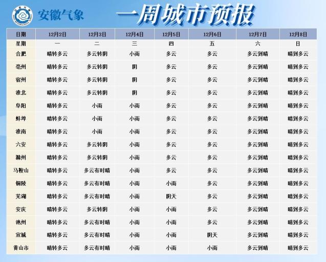 9-10日(星期一至星期二):淮北地区晴天至阴天;淮河以南多云至阴天,部分地区有小雨。
