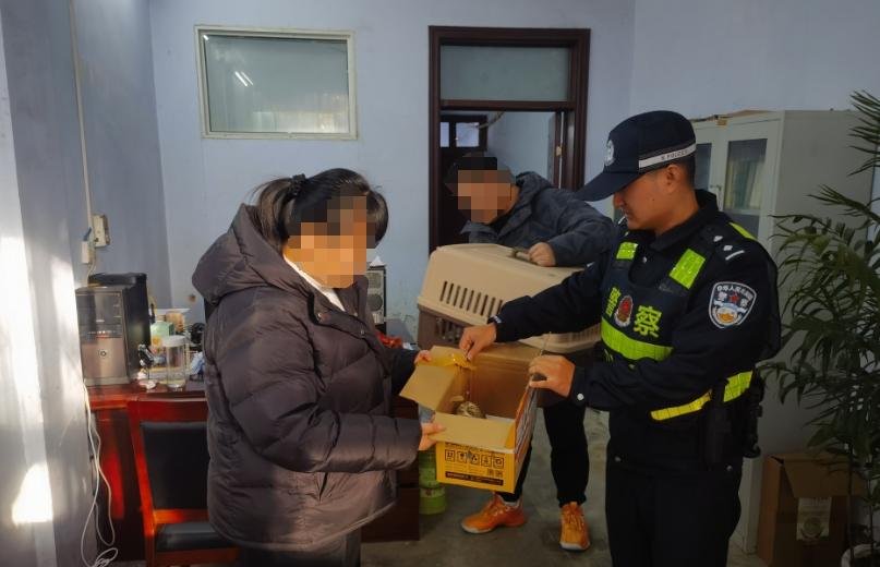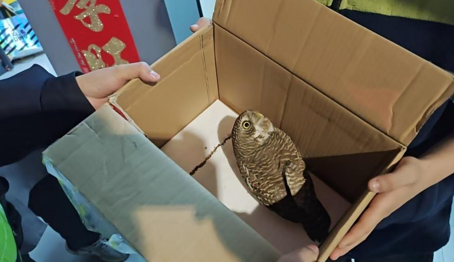 当天中午12点左右,桐柏县公安局城关派出所接到一名儿童彭某报警求助,称其在经过市区某路段时,意外发现一只翅膀和腿部受伤的猫头鹰无法飞行,并向公安部门求助。值班民警迅速赶到现场,称赞彭某对大自然的热爱和对猫头鹰的关怀。警察用纸箱把猫头鹰带到警察局。经过仔细检查,发现猫头鹰雏鸟的腿和翅膀上有轻微的划痕,可能是外力碰撞造成的,无法正常航行。