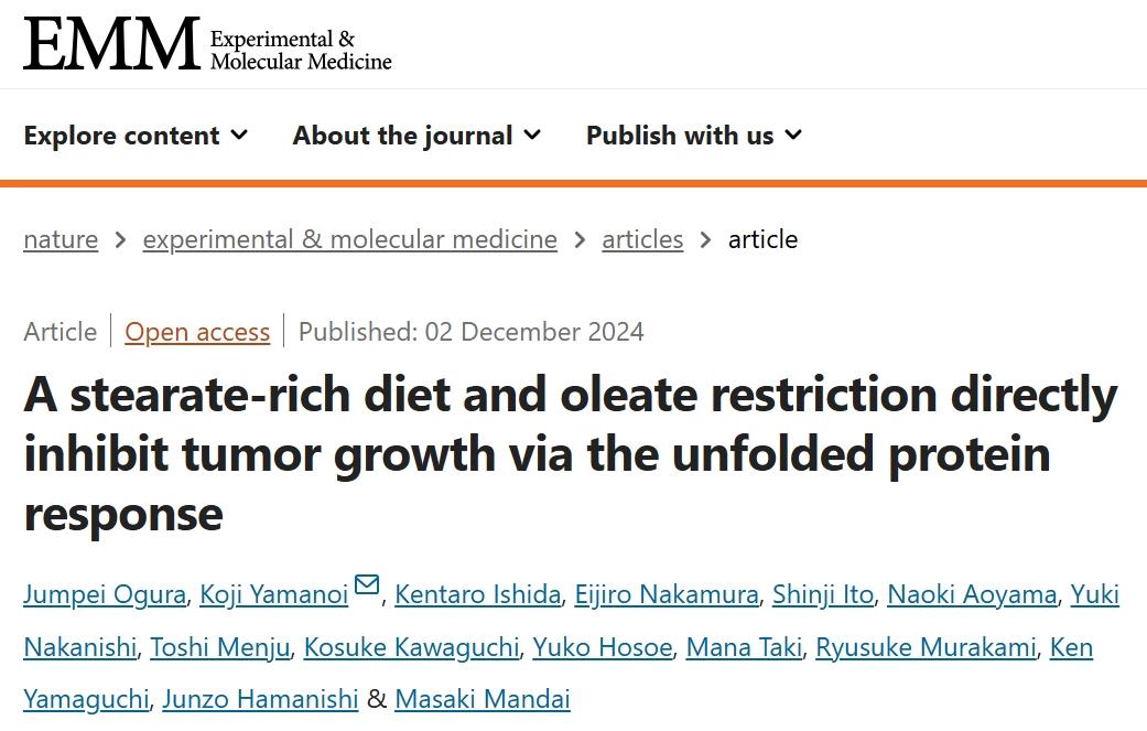 2024年12月2日,Masaki日本京都大学 Mandai 期刊上的教授团队《Experimental & Molecular Medicine》上面发表了题为“A stearate-rich diet and oleate restriction directly inhibit tumor growth via the unfolded protein response"研究论文。该研究表明,通过DNA损伤和UPR介导的细胞坏死机制,可以直接抑制饮食中的硬脂酸盐的肿瘤生长。这项研究表明,饮食中的硬脂酸盐可以直接抑制肿瘤的生长,这涉及到DNA损伤和UPR介导的细胞坏死的机制。通过饮食干预提高硬脂酸水平,降低油酸水平,可能是一个很有前途的癌症治疗策略。