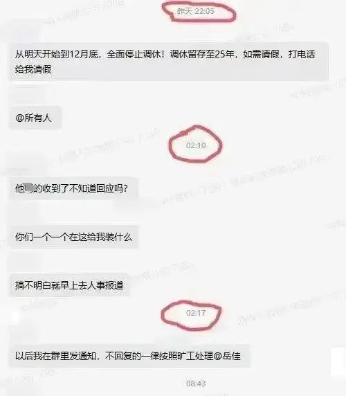 公司负责人在安排相关事务后没有回应,确实耐人寻味。根据截图内容,负责人宣布“停止休息”,@每个人的时间是当天22:05,粗口的时间是4小时后,也就是第二天凌晨2:00。对于这一点,很多网友的评论几乎是一边倒的——“老板半夜发消息也要回复吗?”“员工集体不回复,真的不是老板自己的问题吗?”“这样的老板,我一整天都不想为他工作”…