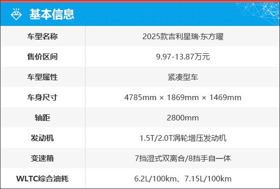 2025 款吉利星瑞 · 东方曜(以下简称“吉利星瑞”)联合推出 5 汽车,售价区间为 9.97-13.87 一万元。这次更新有三个主要变化。首先是增强。 2 汽车,从以前开始 3 款更新至 5 另外一个是丰富了车型的安全配置,最重要的是 2.0T 该车型更换了全新的发动机和变速箱,提高了性能。