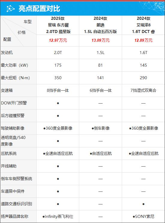 就车辆配置而言,通过对比,13 一万元左右的预算,可以买到吉利星瑞的预算。 2.0T 与朗逸相比,车型 1.5L 艾瑞泽的自吸和自吸 8 的 1.6T 对于发动机来说,排量更大,动力更强。在变速箱方面,朗逸是 6 吉利星瑞为自己挡手, 8 艾瑞泽,挡手自一体 8 为 7 挡湿双离合器。