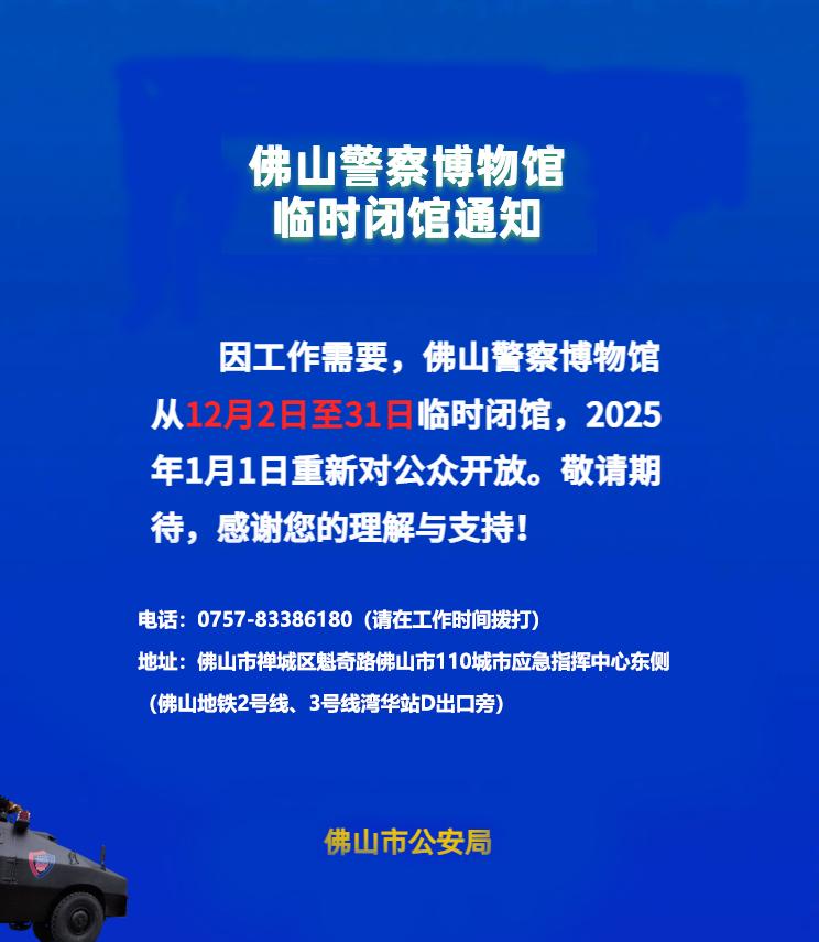 近日,佛山市公安局发布通知,佛山警察博物馆将于12月2日至31日临时关闭,将于2025年元旦重新开放。>>详情:佛山市公安局