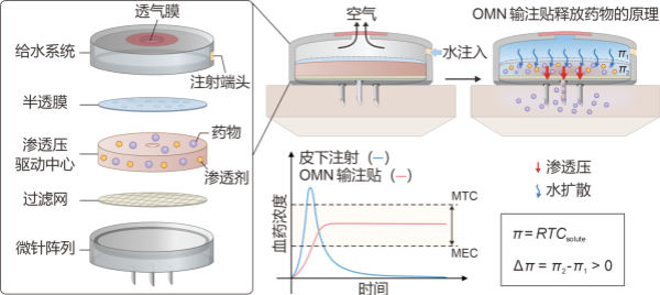 可以穿贴敷滴注贴(Osmotic microneedle patch, OMN)基本结构和原理图
