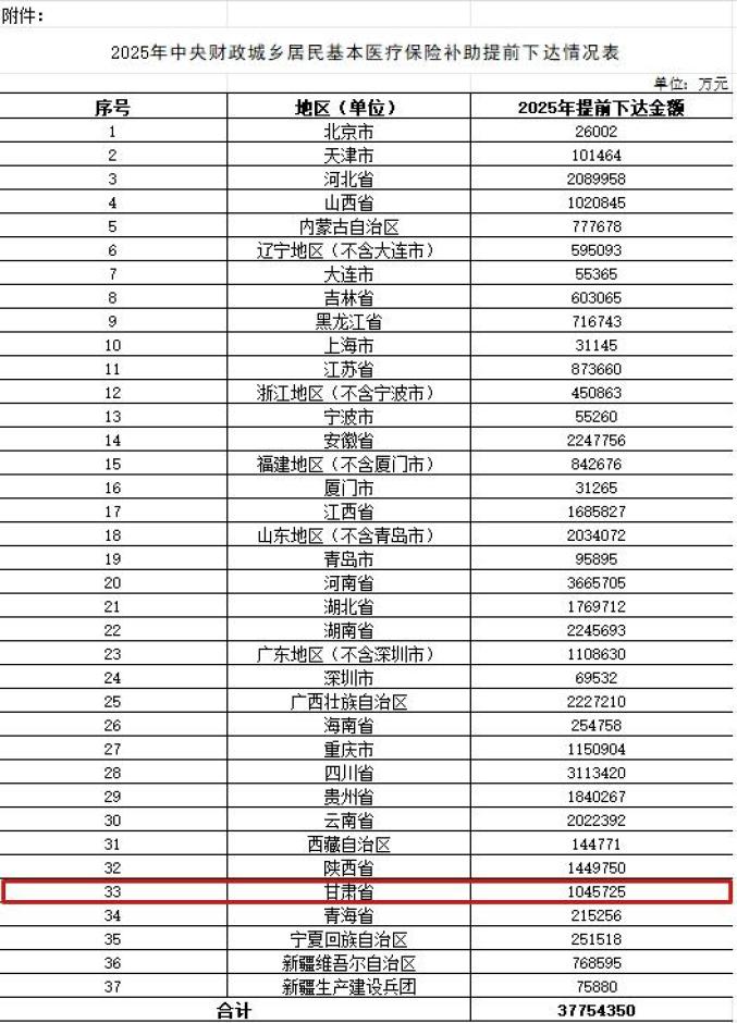 配件:2025年中央财政城乡居民基本医疗保险补贴提前发放情况表